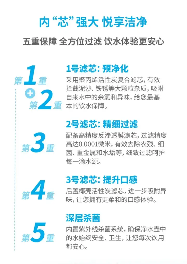 该负责人解释,第一二重保障为“1号滤芯”,实现“预净化”。艾多美净水器采用聚丙烯活性炭复合滤芯,有效拦截泥沙、铁锈等大颗粒杂质,吸附自来水中的余氯和异味,给消费者最基本的饮水保障;第三重保障为“2号滤芯”,实现“精细过滤”。艾多美净水器配备高精度反渗透膜滤芯,过滤精度高达0.0001微米,有效去除农残、细菌、重金属和水垢等,细致过滤呵护每一滴水源;第四重保障为“3号滤芯”,提升口感。艾多美净水器配备后置椰壳活性炭滤芯,进一步吸附异味,让消费者拥有更柔和的口感体验;第五重保障为深层杀菌。艾多美净水器内置紫外线杀菌系统,确保净水壶中的水始终安全、卫生,让消费者每次饮用都安心。