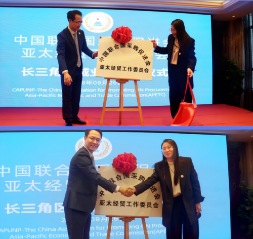 在全场热烈的掌声中,启动仪式迎来最激动人心的环节——揭牌授牌仪式。中国联合国采购促进会亚太经贸工作委员会执行主任陈颖与钧天国际董事长应安平共同上前,随着红绸缓缓落下,长三角区域业务联络点正式亮相,标志着国家级经贸赋能平台在华东地区落地生根。