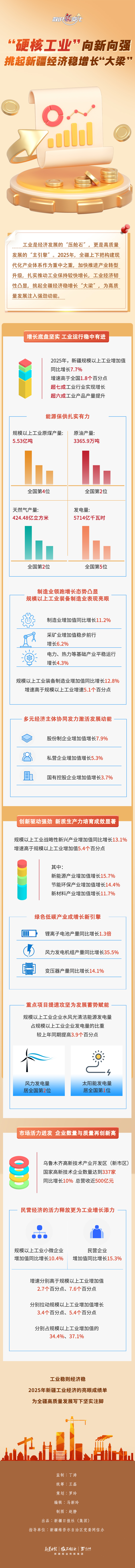 2025年,新疆把构建现代化产业体系作为重点任务,持续推动产业转型升级,工业经济实现较快增长,韧性显著增强,挑起新疆经济稳增长“大梁”,为高质量发展注入强劲动力。本期《数说“新”变化》为您解读2025年新疆工业经济发展的亮点与特征。