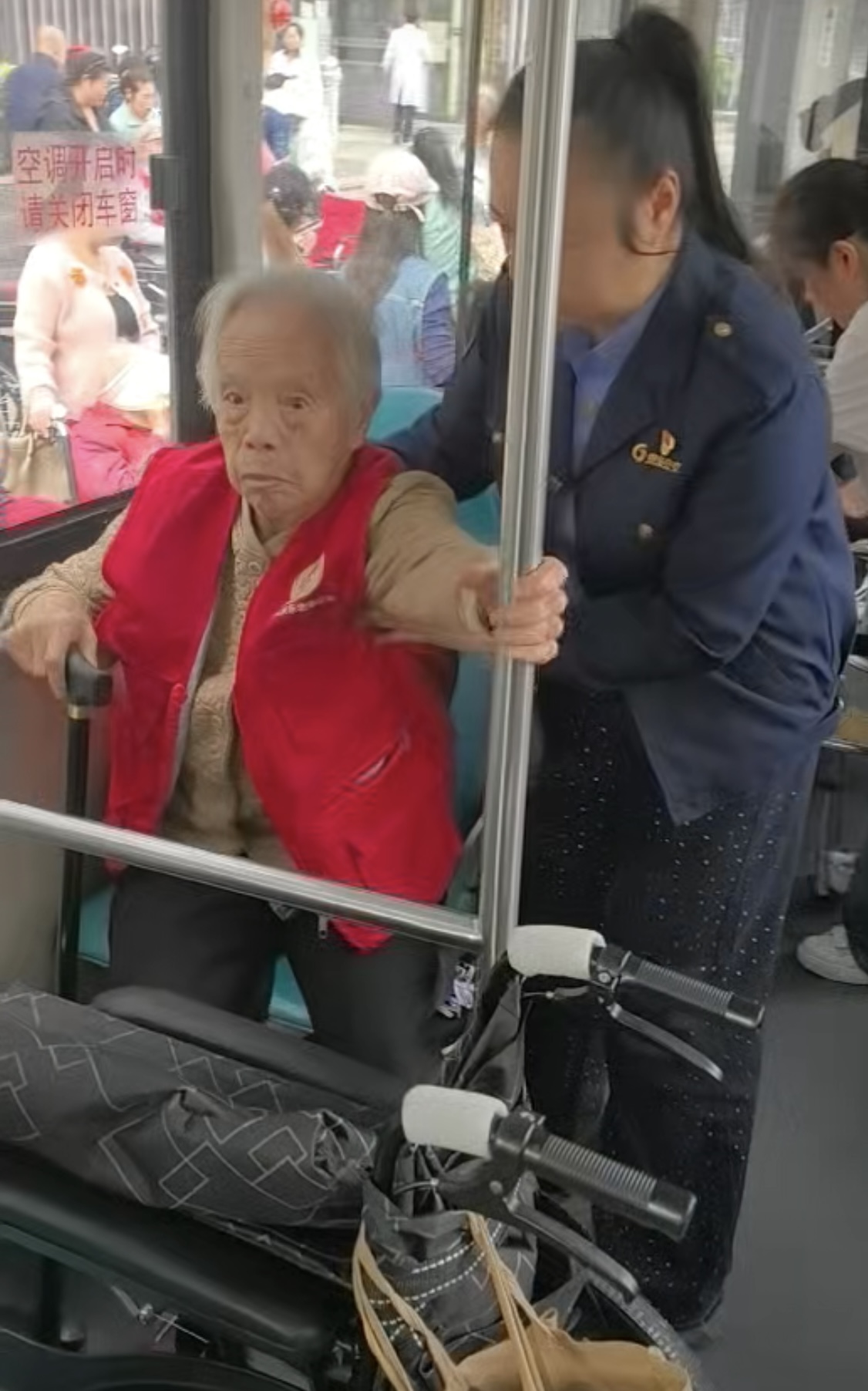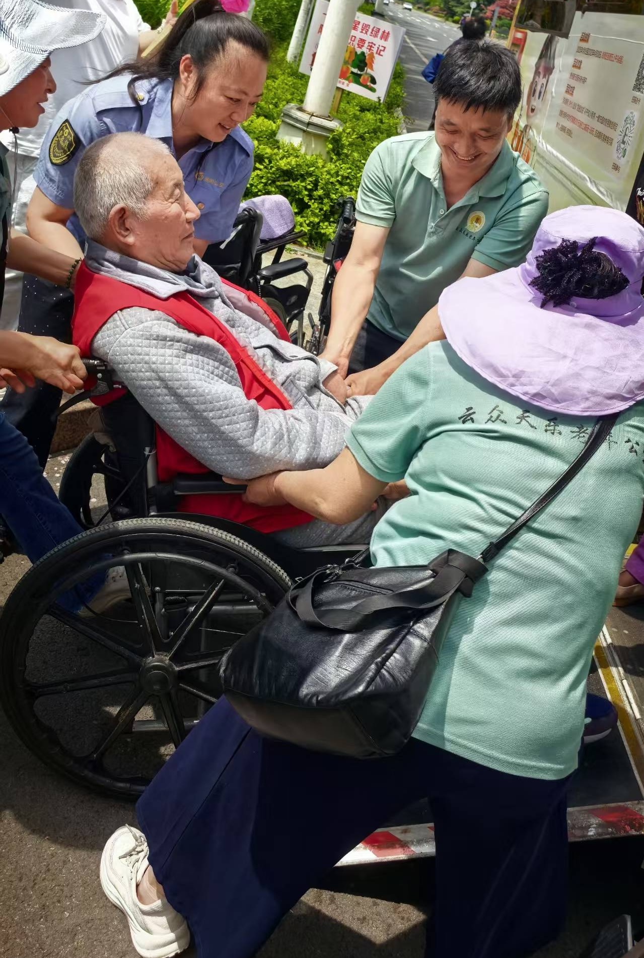 这群老人里,年龄最长者已逾九旬,大多步履蹒跚,更有甚者常年依靠轮椅出行。为此,活动当天15路管理人员早早便到岗就位,对车辆进行了深度清洁与全面安全检查。老人们上下车时,线路管理人员与随车医护人员、家属密切配合,或搀扶、或半抱,小心翼翼地将老人护送至座位坐稳;对于乘坐轮椅的老人,管理人员架起无障碍踏板,缓缓将轮椅推上公交车。