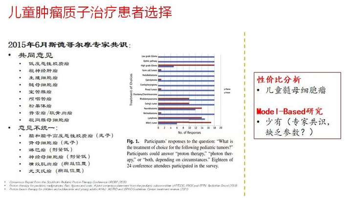 放射治疗在儿童肿瘤治疗中的地位十分重要,许多儿童肿瘤需要放射治疗。但儿童处在生长发育时期,正常器官和组织对放射线非常敏感,受到照射后易出现生长发育延缓和/或畸形、智力障碍、生育异常等等并发症。例如甲状腺受到照射会出现甲状腺功能低下,性腺受到照射会出现性激素分泌不足等,儿童大脑受照会影响智力发展。放射线诱发的第二原发肿瘤问题在儿童患者群体中非常突出,如甲状腺癌,或女孩的乳腺癌。因质子射线在剂量分布中的独特优势,质子在儿童肿瘤患者治疗上的优势非常明显,不但可以提高肿瘤的治疗效果,还因显著降低了正常组织和器官受到的辐射而明显减少了放射治疗相关并发症的发生,尤其是第二原发肿瘤的发生率明显下降。大量研究表明,综合考虑各种直接花费和治疗后并发症治疗所需要的各种费用,质子治疗的总体成本要低于其他的光子放射治疗技术。所以国外的各大放疗中心都把质子治疗作为儿童放射治疗首选的技术。2015年6月,24位世界顶尖儿童肿瘤专家汇聚在瑞典斯德哥尔摩达成共识:儿童肿瘤患者首选质子治疗。